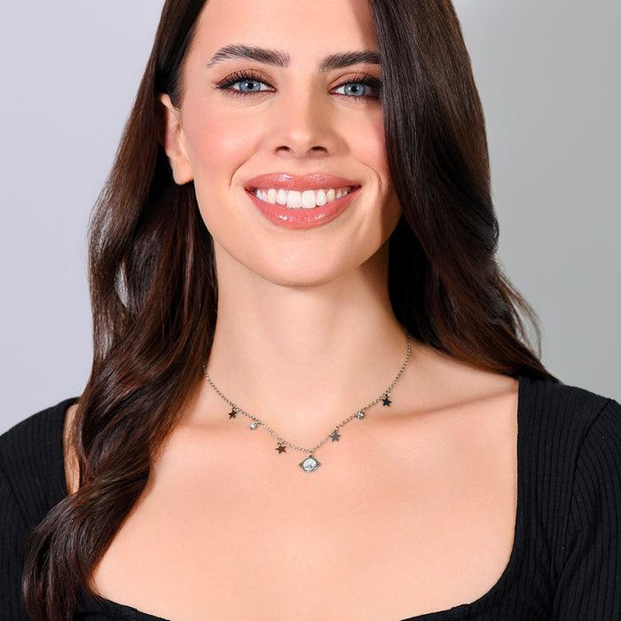 Collana Donna in acciaio con pianeta, stelle e cristalli bianchi. Lunghezza: 40+5 cm. Misura cristalli: 3 mm. Misura pianeta: 13 x 11 mm. Misura stelle: 6 x 7 mm.